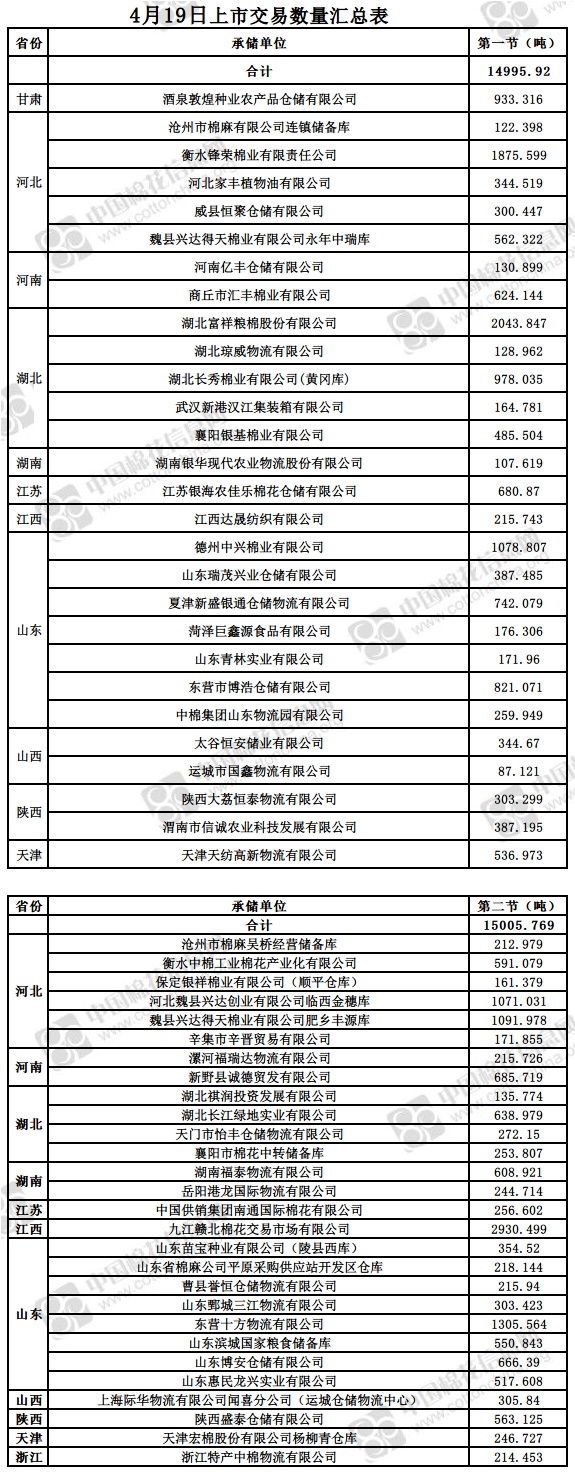 4月19日两节共计轮出储备棉30001.689吨。第一节销售储备棉14995.92吨,其中需要倒垛出库67捆。第二节销售储备棉15005.769吨,其中需要倒垛出库91捆。