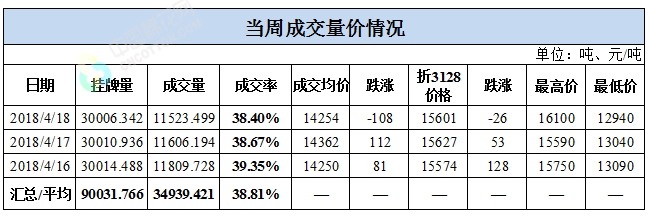 累计情况:截至4月18日,累计计划出库91万吨,累计出库成交44.7万吨,成交率为55%;成交最高价16310元/吨,最低价12700元/吨。