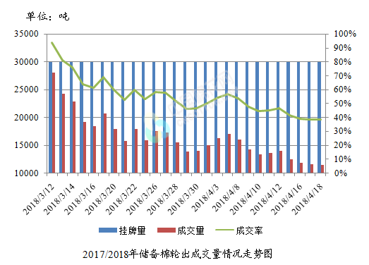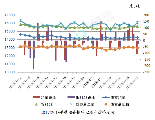 4月18日储备棉轮出销售资源30006.342吨,实际成交11523.499吨,成交率38.40%。平均成交价格14254元/吨(较前一日下跌108元/吨);折3128价格15601元/吨(较前一日下跌26元/吨)。