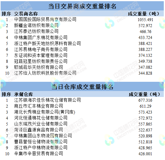 地产棉成交4503.818吨,成交率20%,成交均价13803元/吨,平均加价237元/吨,最高成交价14680元/吨,最低成交价12940元/吨;新疆棉成交7019.681吨,成交率100%,成交均价14543元/吨,平均加价783元/吨,最高成交价16100元/吨,最低成交价13750元/吨。