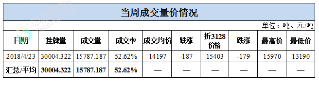 累计情况:截至4月23日,累计计划出库90万吨,累计出库成交48.4万吨,成交率为54%;成交最高价16310元/吨,最低价12700元/吨。