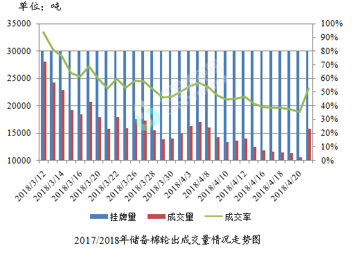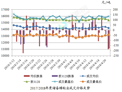 4月23日储备棉轮出销售资源30004.322吨,实际成交15787.187吨,成交率52.62%。平均成交价格14197元/吨(较前一日下降187元/吨);折3128价格15403元/吨(较前一日下降179元/吨)。
