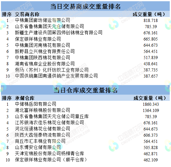 地产棉成交8800.378吨,成交率38%,成交均价13804元/吨,平均加价102元/吨,最高成交价14590元/吨,最低成交价13190元/吨;新疆棉成交6986.809吨,成交率100%,成交均价14692元/吨,平均加价1011元/吨,最高成交价15970元/吨,最低成交价13860元/吨。