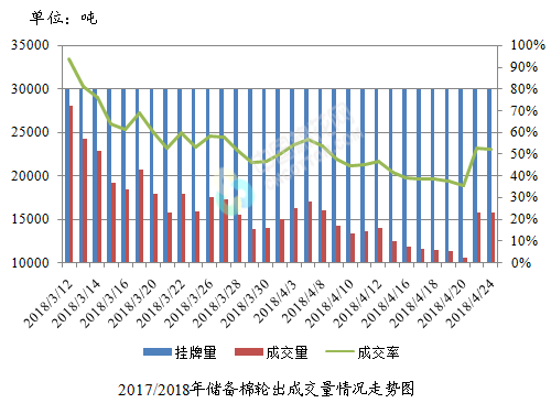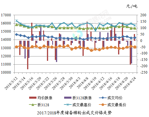 4月24日储备棉轮出销售资源30008.101吨,实际成交15753.749吨,成交率52.50%。平均成交价格14249元/吨(较前一日上涨52元/吨);折3128价格15405元/吨(较前一日上涨2元/吨)。