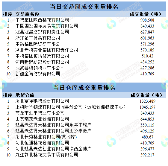 地产棉成交8646.245吨,成交率38%,成交均价13882元/吨,平均加价118元/吨,最高成交价14700元/吨,最低成交价13100元/吨;新疆棉成交7107.504吨,成交率100%,成交均价14695元/吨,平均加价980元/吨,最高成交价15730元/吨,最低成交价13910元/吨。
