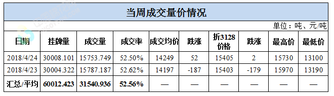 累计情况:截至4月24日,累计计划出库93万吨,累计出库成交49.98万吨,成交率为54%;成交最高价16310元/吨,最低价12700元/吨。