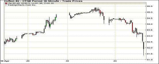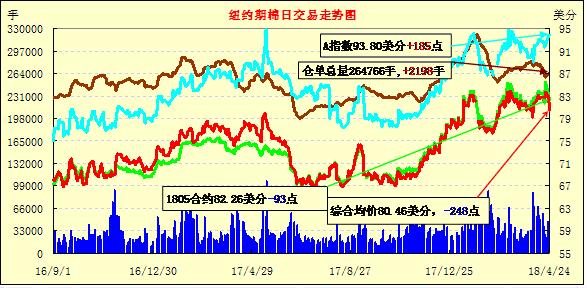 24日纽约期棉市场全面收跌。1805合约结算价82.26美分,跌93点;1807合约结算价81.51美分,跌261点;1812合约结算价77.59美分,跌176点;1903合约结算价77.71美分,跌150点。当日7月合约开盘平稳,开盘后在84-84.5美分区间震荡运行,后卖盘入场,交易重心走低,后低点处买盘发力,市场受支撑小幅上行,在临近收盘卖盘打压交易重心急转直下,最终以大幅下跌收盘(-261)。7月合约收盘价创本月4日以来最低,累计下跌322点。因10年期美债收益率四年来首次触及3%,令投资人担心已经面临成本上升的企业的借款利率会更高,美国股市24日大幅收跌,三大股指均下挫超过1.3%。外围美元指数下跌,玉米期货下跌,大豆和小麦期货上涨。