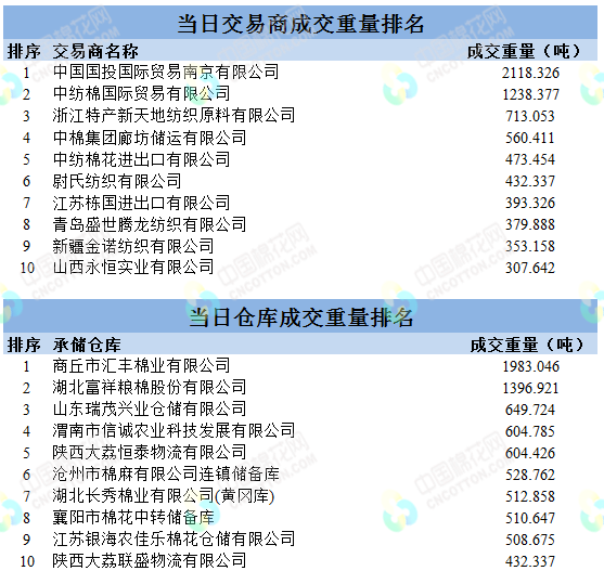 地产棉成交7590.335吨,成交率33%,成交均价13819元/吨,平均加价126元/吨,最高成交价14500元/吨,最低成交价13050元/吨;新疆棉成交7057.407吨,成交率100%,成交均价14706元/吨,平均加价961元/吨,最高成交价15630元/吨,最低成交价13700元/吨。