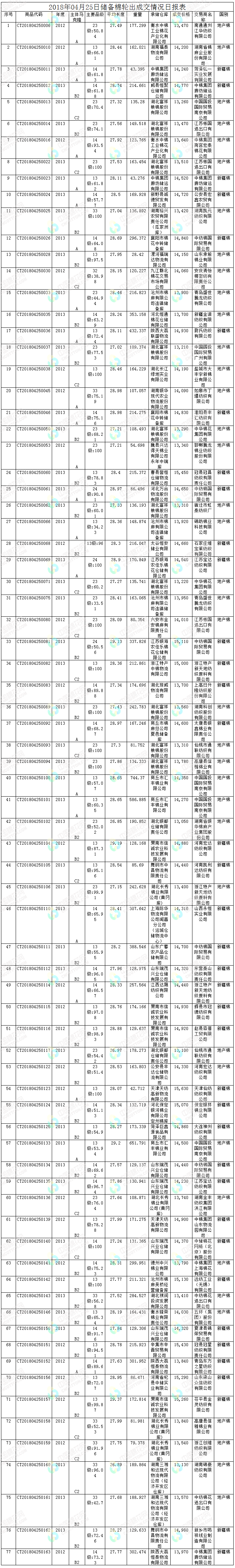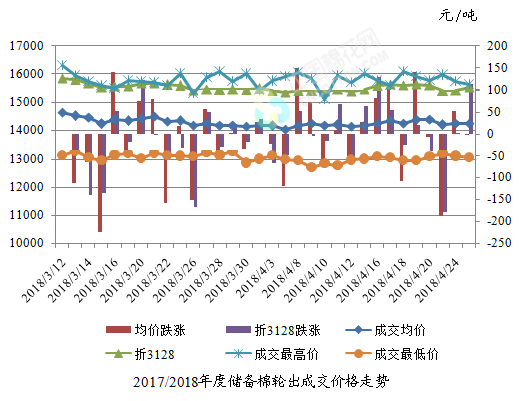 4月25日储备棉轮出销售资源30002.13吨,实际成交14647.742吨,成交率48.82%。平均成交价格14246元/吨(较前一日下降3元/吨);折3128价格15518元/吨(较前一日上涨113元/吨)。