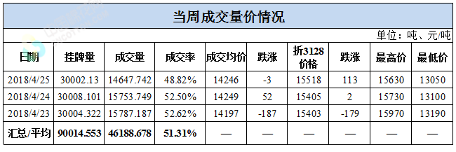 累计情况:截至4月25日,累计计划出库96万吨,累计出库成交51.45万吨,成交率为54%;成交最高价16310元/吨,最低价12700元/吨。