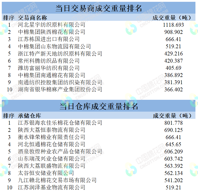 地产棉成交6650.347吨,成交率29%,成交均价13859元/吨,平均加价154元/吨,最高成交价15020元/吨,最低成交价13160元/吨;新疆棉成交7267.733吨,成交率100%,成交均价14595元/吨,平均加价876元/吨,最高成交价16000元/吨,最低成交价13660元/吨。