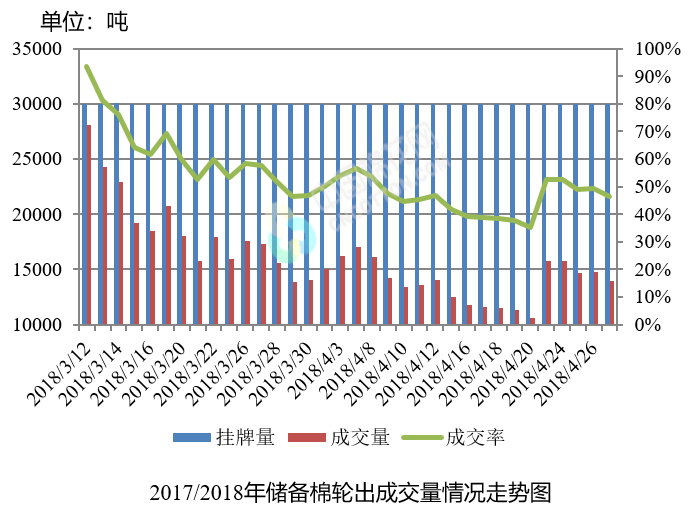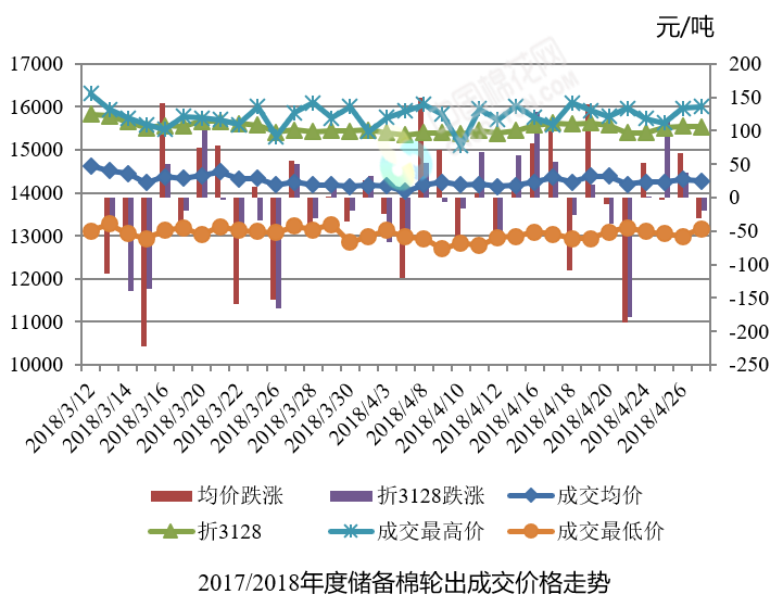 4月27日储备棉轮出销售资源30002.287吨,实际成交13918.08吨,成交率46.39%。平均成交价格14281元/吨(较前一日下跌31元/吨);折3128价格15536元/吨(较前一日下跌19元/吨)。