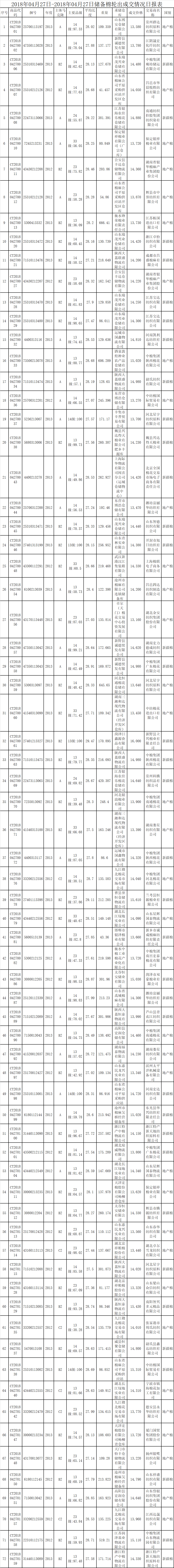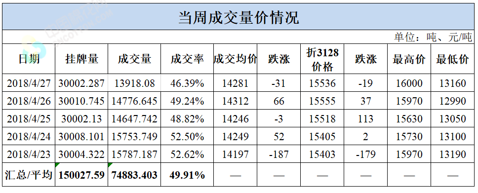 累计情况:截至4月27日,累计计划出库105万吨,累计出库成交54.37万吨,成交率为53%;成交最高价16310元/吨,最低价12700元/吨。