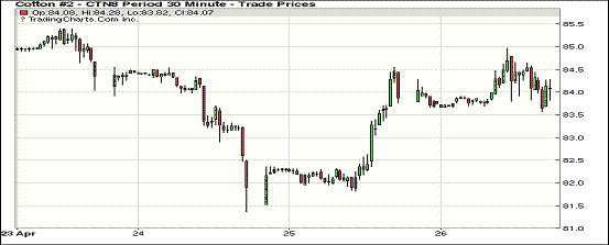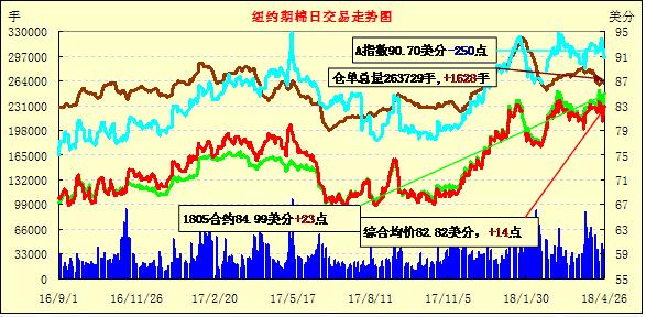 26日纽约期棉市场1807合约结算价84.17美分,涨23点;1812合约结算价78.96美分,跌3点;1903合约结算价78.71美分,跌23点。当日7月合约小幅低开,开盘后在83.50-84.00美分区间内小幅震荡运行,后买盘发力,交易重心小幅走高,美棉出口周报发布后走势良好,符合市场乐观预期,市场受支撑上行至当日高点84.97美分处,后有所回落,最终小幅上涨收盘。据美国农业部(USDA),4.12-4.19日一周美国净签约出口2017/18年度陆地棉70760吨(含新签约72733吨,另取消1973吨前期订单),较前一周增加8%,较近4周平均签约量增加9%;装运2017/18年度陆地棉95572吨,较前一周增加16%,但较近4周平均减少4%。外围美元指数上涨,玉米、大豆和小麦期货下跌。