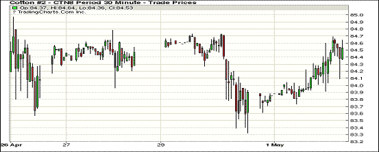 5月第一个交易日主力合约止跌反弹。1807合约结算价84.48美分,涨64点;1812合约结算价78.80美分,涨2点;1903合约结算价78.36美分,跌25点。当日7月合约稳定开盘,开盘后因缺乏有利支撑交易重心走低,至当日低点83.61美分处买盘发力,市场受支撑上行,盘中虽几次承压走低,但整体呈上升态势,临近收盘处交易重心回落,最终未能站上84.5美分一线,但仍以小幅上涨收盘。西德州旱情引发市场持续关注。虽然近期该区域出现几次短时降雨,但未能使旱情得到明显缓解。详情请关注本网稍后发布的美国主产棉区天气状况一览。外围美元指数上涨,玉米、大豆和小麦期货上涨。
