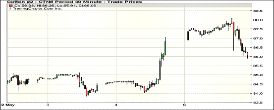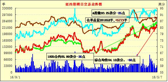 7日纽约期棉市场近跌远涨。1807合约结算价85.99美分,跌91点;1812合约结算价80.33美分,跌24点;1903合约结算价80.07美分,涨5点。其他合约上涨16-65点不等。当日7月合约稳定开盘,开盘后受买盘支撑交易重心上行突破88美分一线,至该合约高点88.08美分处卖盘入场,市场承压调头向下一路下挫击穿86.5美分,后买盘低点发力,重心回调,但因上涨动力不足,最终跌势收盘。外围美元指数上涨,大豆、玉米和小麦期货下跌。