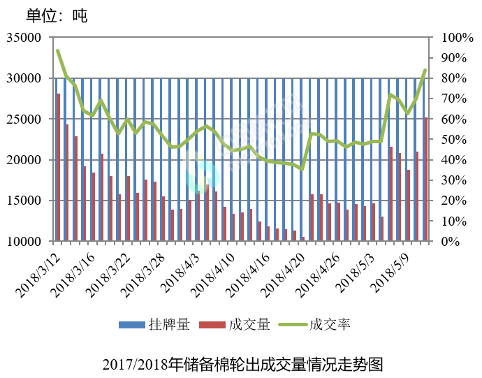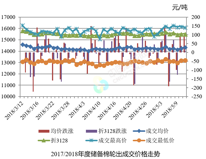 5月11日储备棉轮出销售资源30003.196吨,实际成交25162.484吨,成交率83.87%。平均成交价格14359元/吨(较前一日上涨93元/吨);折3128价格15543元/吨(较前一日上涨12元/吨)。