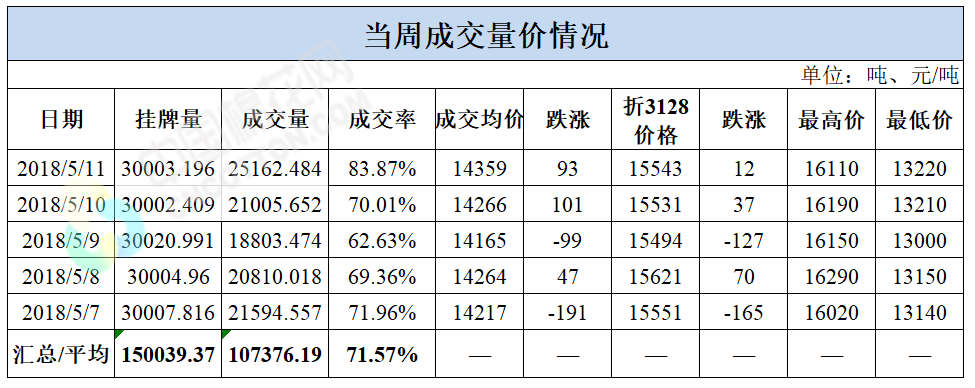 累计情况:截至5月11日,累计计划出库129万吨,累计出库成交70.7万吨,成交率为55%;成交最高价16310元/吨,最低价12700元/吨。
