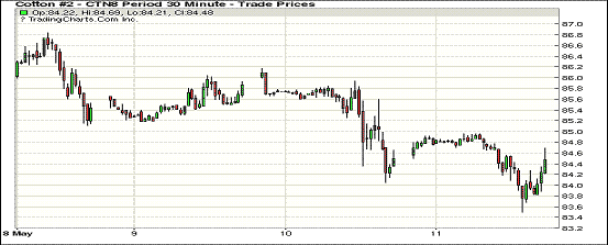 11日纽约期棉市场近涨远跌。1807合约结算价84.62美分,涨6点;1812合约结算价80.24美分,涨13点;1903合约结算价80.06美分,涨18点。7月合约稳定开盘,开盘后在84.50-85美分区间震荡运行,后卖盘入场,市场承压走低,至当日低点83.50美分处买盘发力,交易重心上行,最终小幅收涨。据CFTC,截至5月4日ICE期棉未点价合约量累计163680张,较前一周增加3612张。其中,1807合约55085张,减469张;1812合约38546张,增加1129张。大量未点价合约对期棉行情形成支撑。外围美元指数下跌,大豆、小麦和玉米期货下跌。