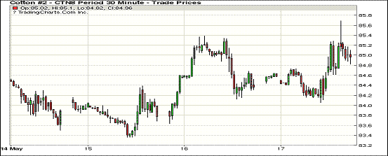 17日纽约期棉市场涨势延续。1807合约结算价85.03美分,涨68点;1812合约结算价81.45美分,涨76点;1903合约结算价81.36美分,涨87点。当日7月合约小幅高开,开盘后市场受支撑小幅上行,围绕84.6美分一线震荡运行,后卖盘入场,交易重心小幅走低,至84.2美分处市场维持窄幅震荡态势,后低点处买盘发力,市场被大幅拉高,至当日高点85.69美分,卖盘低点入场,交易重心有所回落,最终以小幅上涨收盘。1807合约连续第五个交易日收涨。据美国农业部(USDA),5.3-5.10日一周美国净签约出口2017/18年度陆地棉34768吨(含新签约42706吨,另取消7938吨前期订单),较前一周减少21%,较近4周平均签约量减少38%;装运2017/18年度陆地棉95867吨,较前一周减少17%,较近4周平均减少2%。外围美元指数上涨,小麦期货上涨,玉米和大豆期货下跌。