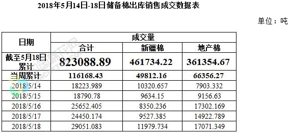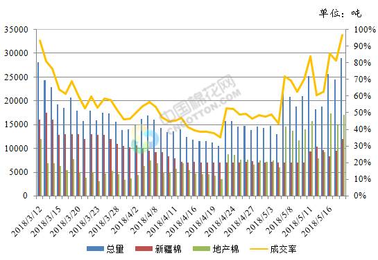 截至2018年5月18日,2017/2018年度储备棉轮出累计挂牌144万吨,其中新疆棉46万吨、地产棉98万吨;累计成交82万吨,成交率57%,其中新疆棉成交46万吨,成交率99.99%,地产棉成交36万吨,成交率37%;累计成交企业520家,纺织企业成交37万吨,占比45%;贸易商成交45万吨,占比55%。