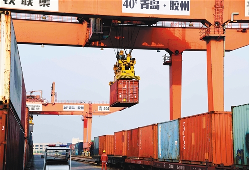 在青岛胶州湾国际物流园,龙门塔吊正在往中亚(青岛)国际班列上装载货物(5月7日摄)。截至5月29日,2010年开行的中亚(青岛)国际班列青岛地区已开行3039列。中亚(青岛)国际班列密切联系着青岛与上合组织有关国家的经贸往来。