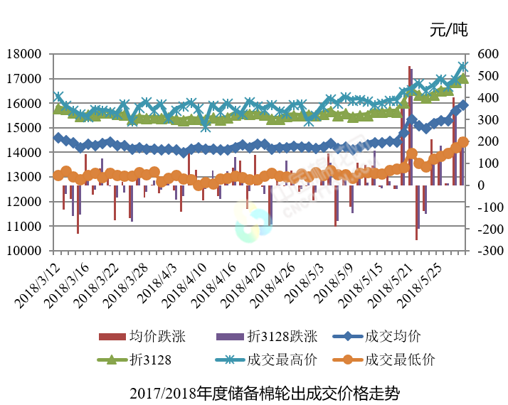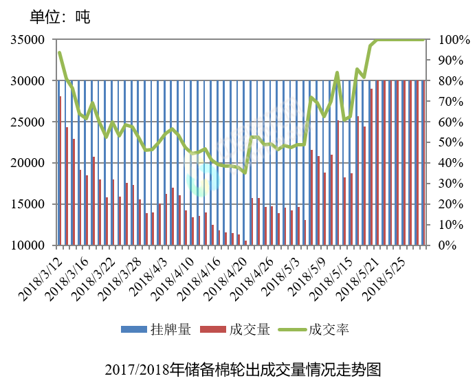 5月30日储备棉轮出销售资源30015.107吨,实际成交30015.107吨,成交率100.00%。平均成交价格15973元/吨(较前一日上涨221元/吨);折3128价格17087元/吨(较前一日上涨192元/吨)。