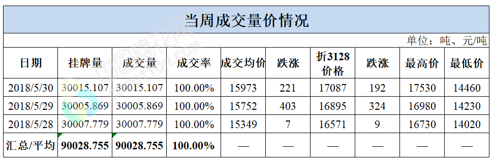 累计情况:截至5月29日,累计计划出库168万吨,累计出库成交106.3万吨,成交率为63%;成交最高价17530元/吨,最低价13900元/吨。