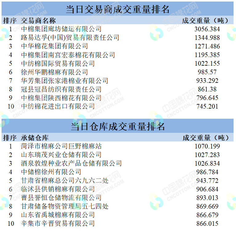地产棉成交9312.698吨,成交率100%,成交均价15381元/吨,平均加价1327元/吨,最高成交价16810元/吨,最低成交价14460元/吨;新疆棉成交20702.409吨,成交率100%,成交均价16240元/吨,平均加价2018元/吨,最高成交价17530元/吨,最低成交价15440元/吨。