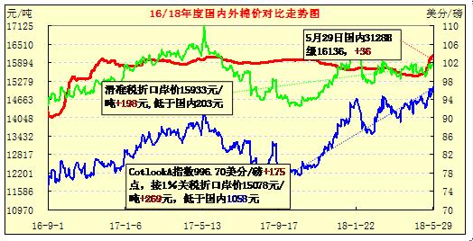 5月29日内外棉价联动暴涨,内外价差平稳。受隔日郑棉期货涨停和纽约期继续收涨影响,国内现货棉价大幅上调,328B指数涨93元,报16136元/吨,Cotlook A指数96.70美分/磅,涨175点。滑准税折口岸价15933元,1%税率折口岸价15078元/吨,分别较昨日涨198和269元,内外棉价差分别为203和1058元。