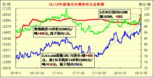 5月30日内外棉价联动暴涨,外棉涨速快于内棉,内外价差收窄。受隔日郑棉期货涨停和纽约期继续收涨影响,国内现货棉价大幅上调,328B指数涨262元,报16398元/吨,Cotlook A指数100.7美分/磅,大涨400点。滑准税折口岸价16399元,1%税率折口岸价15694元/吨,分别较昨日涨466和616元,内外棉价差分别为,滑准税折口岸价与国内持平,1%关税折口岸价缩小至466元。从近期新棉国际棉价走势情况看,预期可能将面临高棉价时期,目前国际新年度棉价民升至102美分/磅。
