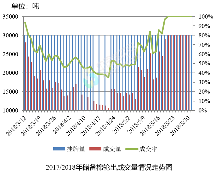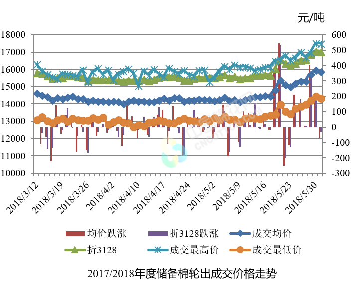 5月31日储备棉轮出销售资源30000.5852吨,实际成交30000.5852吨,成交率100.00%。平均成交价格15902元/吨(较前一日下跌71元/吨);折3128价格17056元/吨(较前一日下跌31元/吨)。