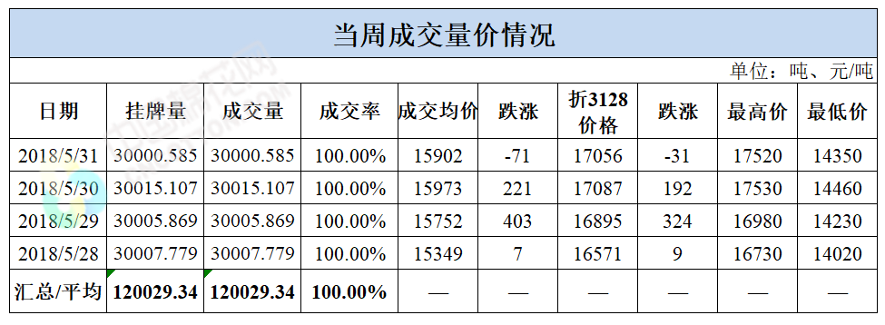 累计情况:截至5月31日,累计计划出库171万吨,累计出库成交109.3万吨,成交率为64%;成交最高价17530元/吨,最低价12700元/吨。