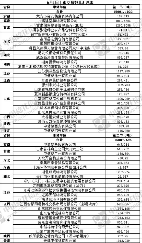 6月1日两节共计轮出储备棉30008.6972吨。第一节销售储备棉15001.1022吨,其中需要倒垛出库80捆。第二节销售储备棉15007.595吨,其中需要倒垛出库111捆。