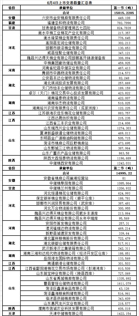 6月4日两节共计轮出储备棉30010.4485吨。第一节销售储备棉15015.2285吨,其中需要倒垛出库89捆。第二节销售储备棉14995.22吨,其中需要倒垛出库86捆。