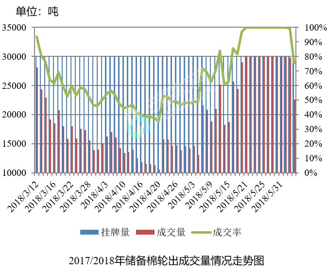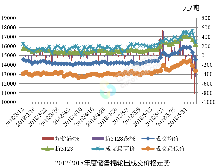 6月5日储备棉轮出销售资源30000.9693吨,实际成交22578.7833吨,成交率75.26%。平均成交价格14598元/吨(较前一日下跌832元/吨);折3128价格16254元/吨(较前一日下跌453元/吨)。