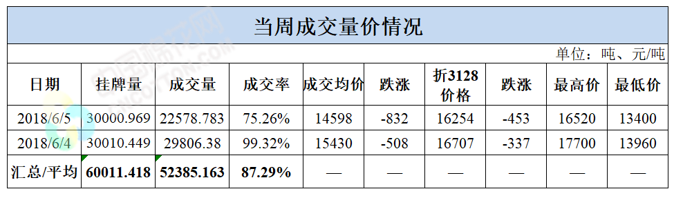 累计情况:截至6月5日,累计计划出库180万吨,累计出库成交118万吨,成交率为65%;成交最高价17700元/吨,最低价12700元/吨。