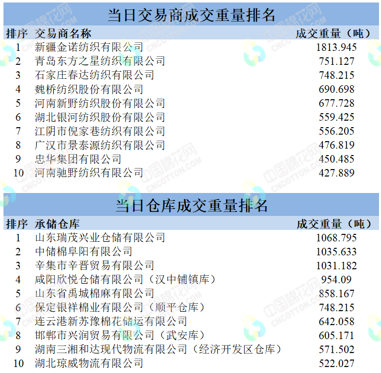 地产棉成交6955.788吨,成交率53%,成交均价14165元/吨,平均加价295元/吨,最高成交价16520元/吨,最低成交价13400元/吨;新疆棉成交15622.9953吨,成交率92%,成交均价14791元/吨,平均加价452元/吨,最高成交价15980元/吨,最低成交价13540元/吨。