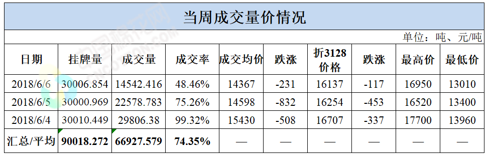 累计情况:截至6月6日,累计计划出库183万吨,累计出库成交119万吨,成交率为65%;成交最高价17700元/吨,最低价12700元/吨。