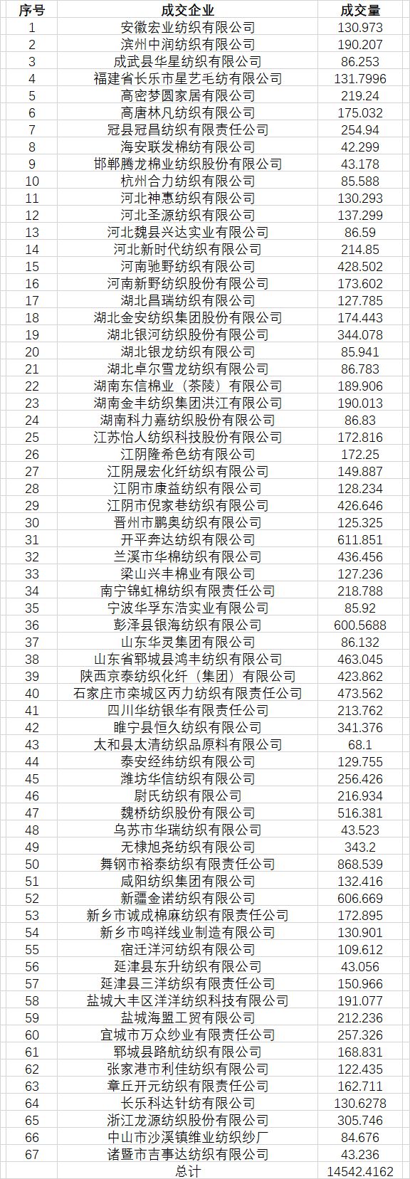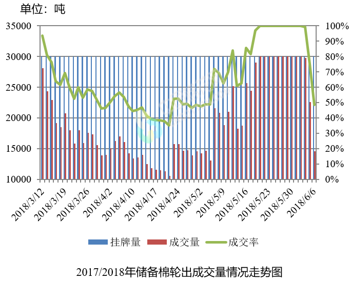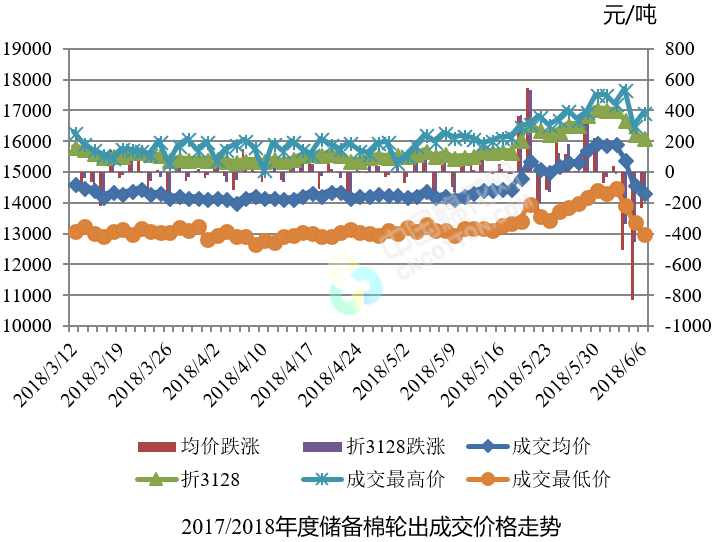 6月6日储备棉轮出销售资源30006.8537吨,实际成交14542.4162吨,成交率48.46%。平均成交价格14367元/吨(较前一日下跌231元/吨);折3128价格16137元/吨(较前一日下跌117元/吨)。
