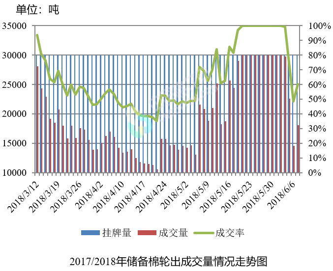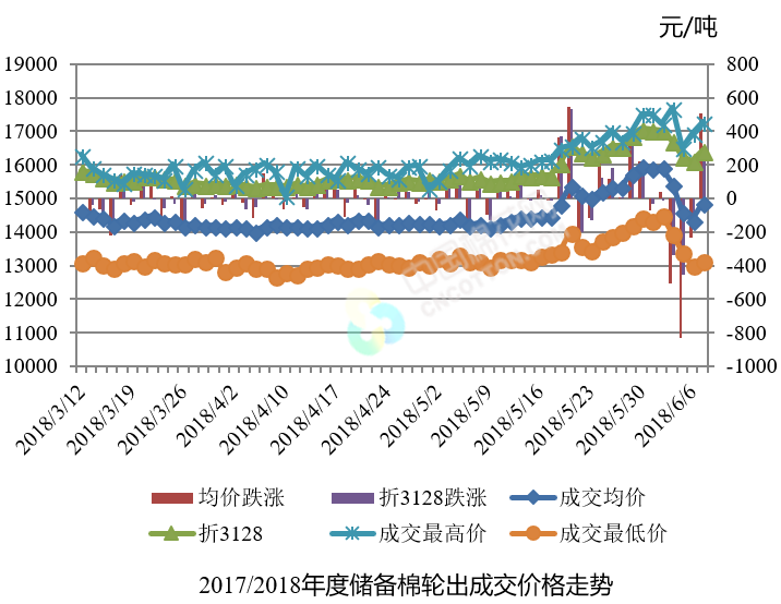 6月7日储备棉轮出销售资源30009.8111吨,实际成交18050.3501吨,成交率60.15%。平均成交价格14872元/吨(较前一日上涨505元/吨);折3128价格16446元/吨(较前一日上涨309元/吨)。