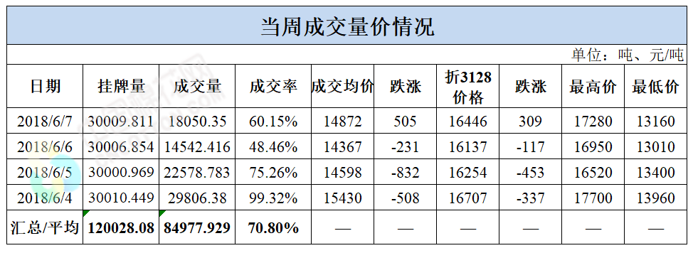 累计情况:截至6月7日,累计计划出库186万吨,累计出库成交120.8万吨,成交率为65%;成交最高价17700元/吨,最低价12700元/吨。