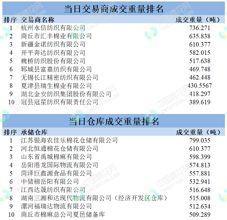 地产棉成交6450.99吨,成交率35%,成交均价14129元/吨,平均加价263元/吨,最高成交价16090元/吨,最低成交价13160元/吨;新疆棉成交11599.4吨,成交率100%,成交均价15285元/吨,平均加价779元/吨,最高成交价17280元/吨,最低成交价13840元/吨。