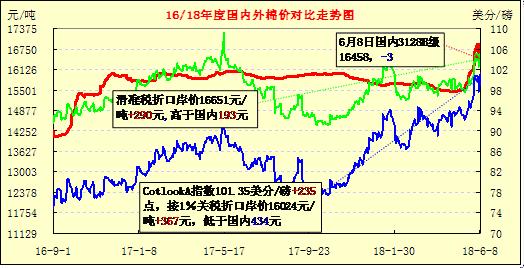 6月8日棉价内稳外续涨,价差接轨。受郑棉期货调整影响,国内现货报价企稳,标准级棉价报16458元/吨,与前一交易日持平;受7日纽约期棉大幅反弹影响,国际棉价继续暴涨,国际A指数报101.35美分/磅,涨235点,涨幅2.4%,滑准税折口岸价16651元,1%税率折口岸价16024元/吨,分别较昨日涨290和367元,涨幅分别为1.8%和2.3%。外涨内稳,内外价大致持平,其中1%税率折口岸价仅低于国际棉价434元/吨,滑准税折口岸价反高于国际棉价193元/吨。