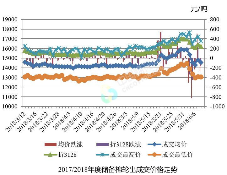 6月11日储备棉轮出销售资源30011.9985吨,实际成交11704.4875吨,成交率39.00%。平均成交价格14977元/吨(较前一日上涨371元/吨);折3128价格16449元/吨(较前一日上涨172元/吨)。