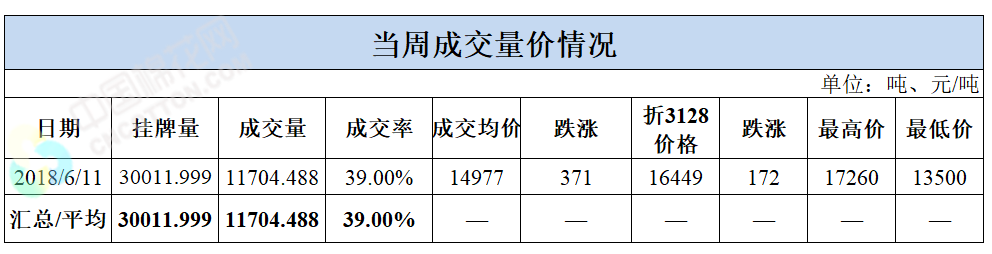 累计情况:截至6月11日,累计计划出库192万吨,累计出库成交123.7万吨,成交率为64%;成交最高价17700元/吨,最低价12700元/吨。