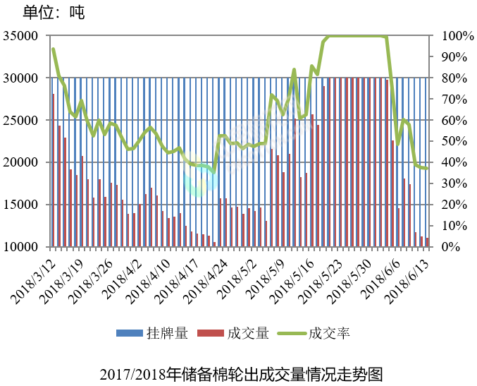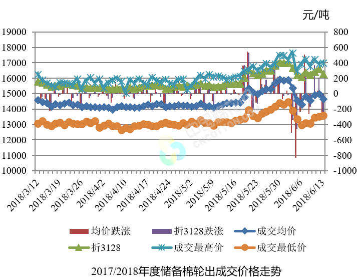 6月13日储备棉轮出销售资源30000.2152吨,实际成交11111.0482吨,成交率37.04%。平均成交价格14699元/吨(较前一日下跌318元/吨);折3128价格16318元/吨(较前一日下跌339元/吨)。