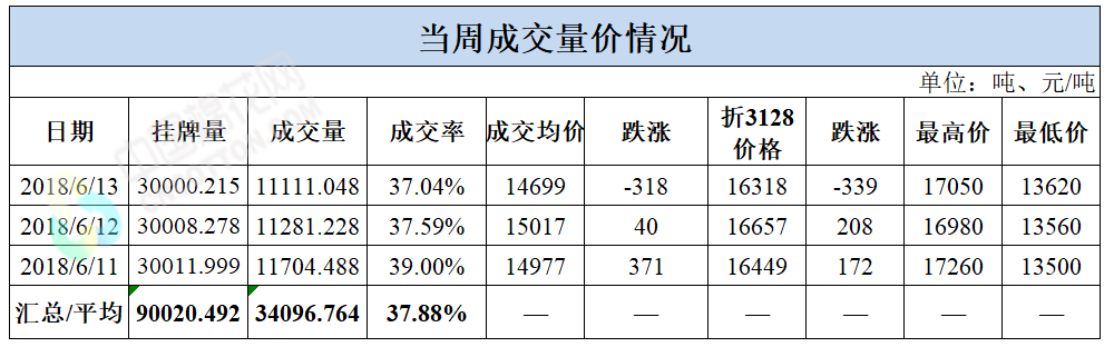 累计情况:截至6月13日,累计计划出库198万吨,累计出库成交125.9万吨,成交率为64%;成交最高价17700元/吨,最低价12700元/吨。
