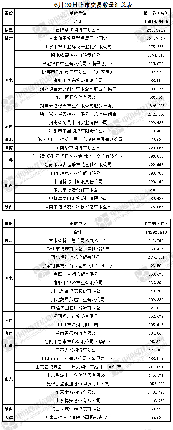 6月20日两节共计轮出储备棉30007.2585吨。第一节销售储备棉15014.6405吨,其中需要倒垛出库78捆。第二节销售储备棉14992.618吨,其中需要倒垛出库60捆。