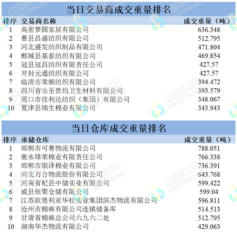 地产棉成交598.413吨,成交率3.02%,成交均价14659元/吨,平均加价30元/吨,最高成交价15440元/吨,最低成交价14000元/吨;新疆棉成交8631.5662吨,成交率84.74%,成交均价15272元/吨,平均加价556元/吨,最高成交价16300元/吨,最低成交价14440元/吨。